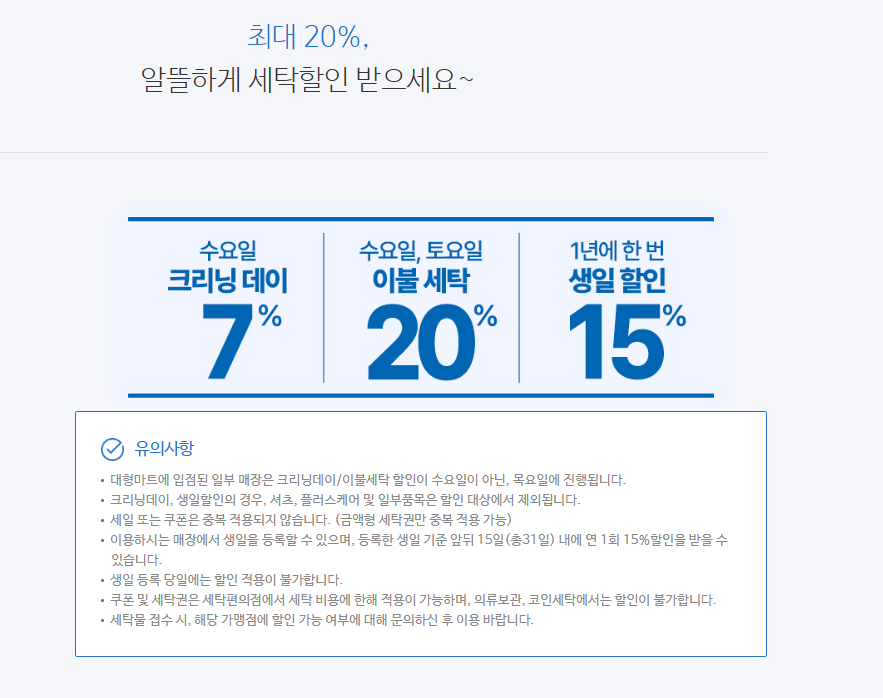 매주 **수요일**에 이불을 제외한 모든 세탁물을 접수하면 돼요. - 💰 생일 할인 (20% 할인)