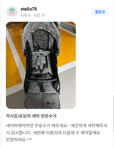- hj****님: "처음으로 유모차 세탁을 맡겼는데 너무 편리하고 깨끗하게 해주셔서 감사합니다! 세탁하는 과정을 찍어서 사진도 보내주시고 너무 좋네요 다음엔 카시트도 맡겨볼까합니다😀"