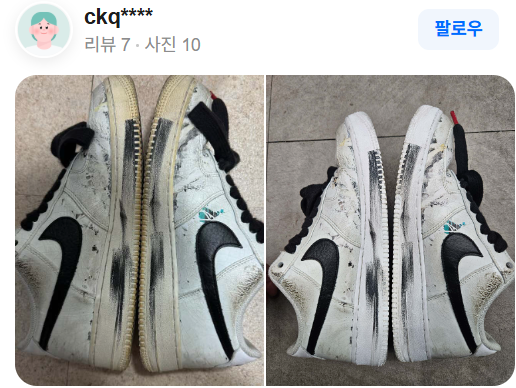 황변되고 자주 못 신다가 흠뻑쇼까지 다녀왔던 신발이라 다시 신을 수 있을까 싶을 정도로 더러웠는데….생각보다 더 깨끗해지고 빠르게 보내주셔서 너무 만족스러워요 감사합니다! 깨끗하게 잘 신을게요 😁