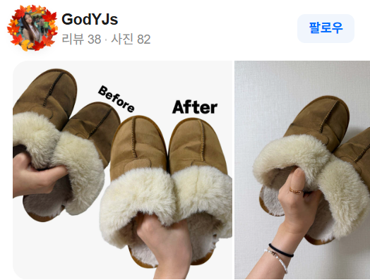 어그슬리퍼 세탁 전/후 딱봐도 티가나죠~? ㅎㅎ 겨울을 맞이해 어그세탁 했어요! 어그는 세탁하는 거 아니라던데???? 더러운 거 어떡해여,, 부산 어그세탁하는 곳 찾아갔죠😊 너무 만족스러운 세탁 입니다!!👍🏻