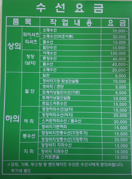 - 특징: 35년 경력의 옷수선 명장이 직접 수선하는 곳으로, 단순한 수선을 넘어 옷에 새로운 가치를 부여하는 데 중점을 둡니다. "딱 맞는 옷을 입었을 때의 편안함. 낡은 옷이 새로운 옷으로 바뀌었을 때의 즐거움. 그리고 영원한 추억. 이 모든 것을 고객님께 정직하고 성실하게 드리겠습니다."라는 명장님의 철학이 돋보입니다.