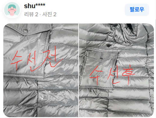 "고가 브랜드 괜찮은 수선집 찾다가 알게되었어요 거리가 너무 멀어서 가까운 아울렛에서 수선맡기다가 망한 옷 재수선 부탁드렸는데 정말 섬세하고 꼼꼼하게 잘해주셨어요. (워낙 예민한편인데 여기 진짜 최고에요..)"