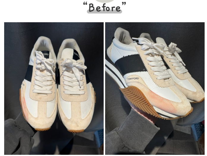 절제된 섹시함과 완벽한 밸런스, 톰포드 제임스 스니커즈입니다. 스웨이드 소재는 관리가 까다로워 이염이 생기기 쉬운데요. 소재의 질감을 손상시키지 않으면서 이염만 말끔하게 제거하고 클리닝하여 톰포드 특유의 럭셔리한 무드를 되찾아 드렸습니다.