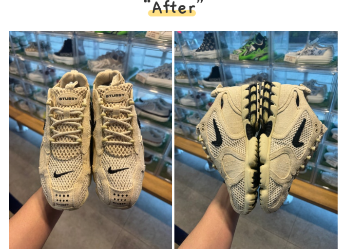 2000년대 레트로 러닝화에 스트릿 무드를 더한 나이키 x 스투시(나투시)입니다. 메쉬 소재 사이사이 낀 먼지와 오염을 제거하는 디테일링 클리닝을 통해, 새 신발 같은 깨끗함과 트렌디한 분위기를 다시 살려냈습니다.