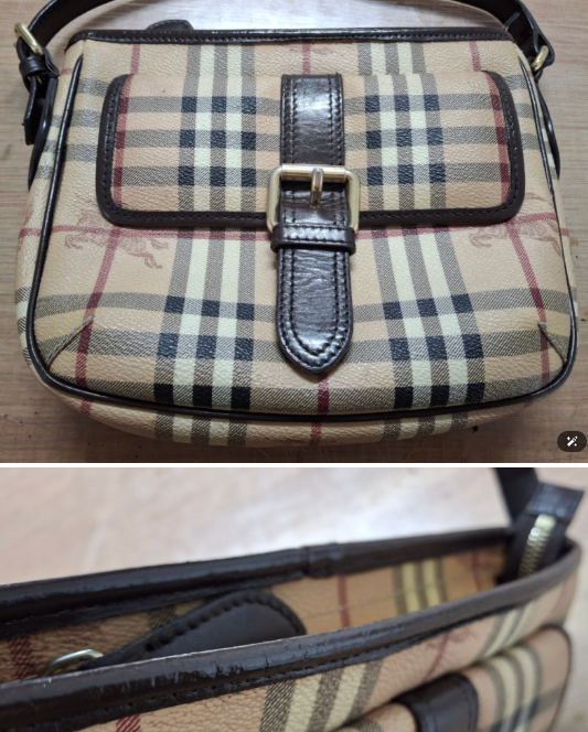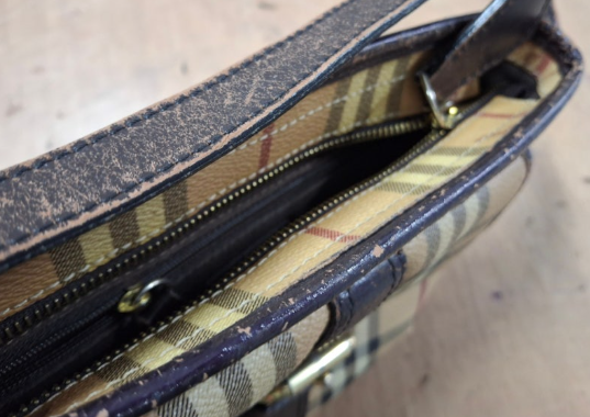 가죽 까짐이 심한 부분은 **염색 작업으로 새 것처럼 복원**했으며, 금속 도금이 벗겨진 버버리 크로스백 장식은 **금도금 작업을 통해 노란빛**을 되찾았습니다. 손잡이 끈 제작도 가능합니다.