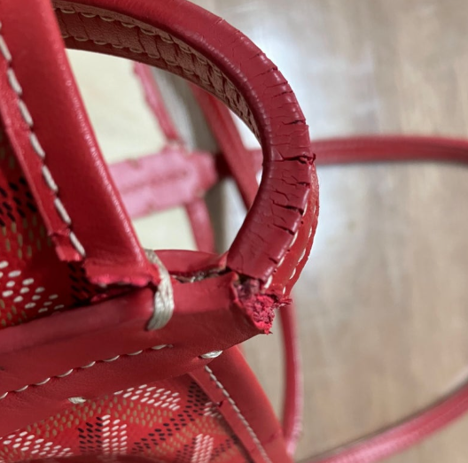 손잡이 끈과 테두리 가죽 부분이 상한 고야드 토트백의 해당 부위를 **새 가죽으로 제작 및 교체**했습니다.
