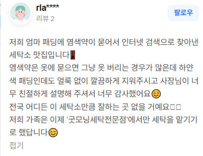 ''저희 엄마 패딩에 염색약이 묻어서 인터넷 검색으로 찾아낸 세탁소 맛집입니다.