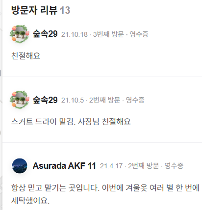 "언제나 친절하다", "수선 잘한다"는 리뷰는 이곳이 동네 주민들의 사랑을 받는 이유를 보여줍니다. **일상적인 드라이클리닝과 간단한 수선이 필요할 때, 가장 안정적이고 편리한 '원스톱 솔루션'**을 제공하는 곳입니다.