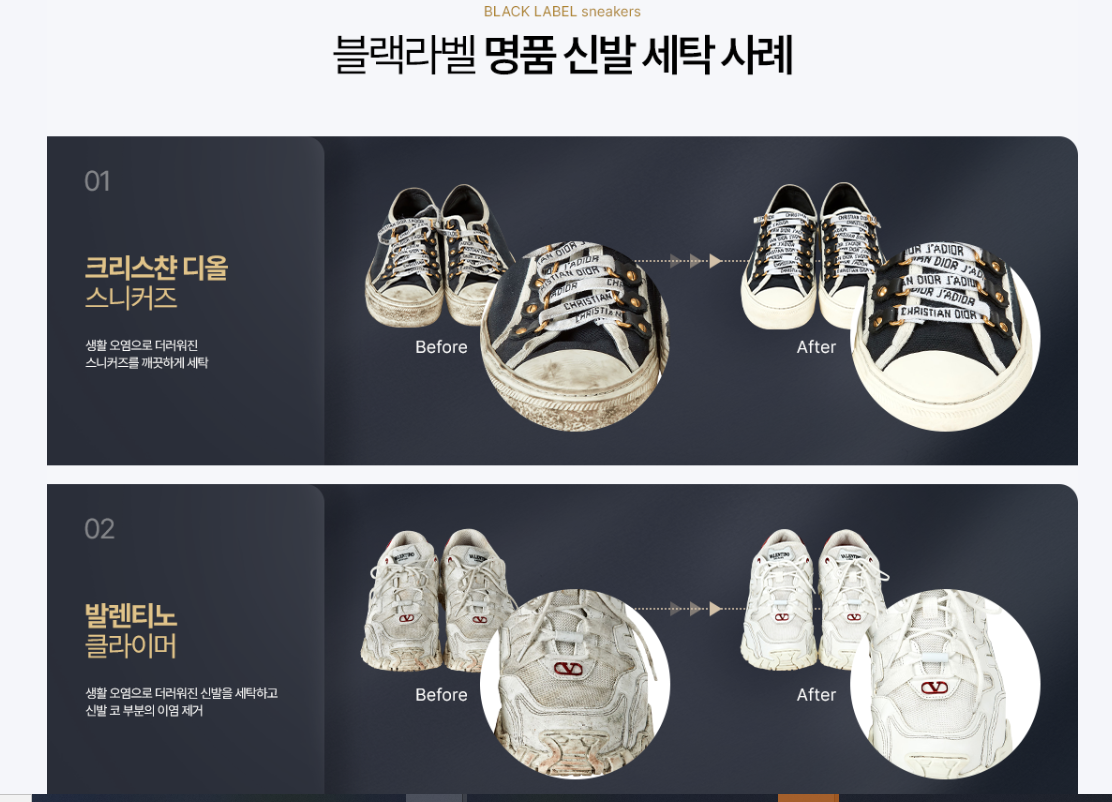 | 수선 서비스 | 주요 세탁 케어 (어그 발수 등) | 명품 가방/신발 수선까지 전문 취급 |